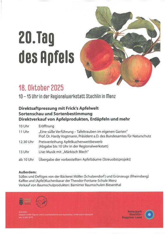 Alle Informationen unter https://www.naturparkmagazin.de/stechlin/jubilaeum-20-apfeltag-in-menz/